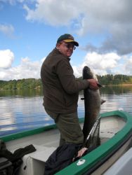 Bardzo podoba mi się „na sucho” REVS610MXF, ale zostawiam tę wędkę na koniec. Teraz będę obławiał REVS68MXF w długości 2,02m, cw. 5-14g do linek w zakresie 6-14lb. Wędka jest niesłychanie sprężysta i szybka dlatego od razu rezygnuję z lekkich przynęt i zaczynam od 15g. Reaguje dość dobrze, ale jaszcze lepiej kiedy zwiększam ciężar główki do 18 gramów. 25 gramów z 3” kopytem nie robi na wędce żadnego wrażenia. Po kilku rzutach decyduję się na 28 gramów i 4” kopyto. Prowadzę przynętę wzdłuż kantu na około 7-8 metrach głębokości. Kontroluję znakomicie tę przynętę i w połowie rzutu czuję potężne branie. Zacinam i ryba natychmiast wybiera około 40-45 metrów linki. Nie mam wątpliwości że to ładny sumek. Ryba jest dość duża i zastanawiam się jak długo będzie trwał hol takiej sztuki na wędce 14lb. Jednocześnie bardzo się cieszę, że będzie to fantastyczny test, taki „do samej rękojeści”. Sum walczy bardzo ostro. Wędzisko pozwala na agresywny hol i dzięki dużej mocy nie pozwalam rybie położyć się na dnie, ale odjazdy z dużym impetem są nie do zatrzymania. Proszę kolegę na sąsiedniej łodzi aby podpłynął i podniósł mi kotwice. Chcę holować komfortowo i uniknąć zaplątania plecionki w linkę kotwicy. Po około 25 minutach holu ryba ląduje w podbieraku. Pomiar-155 cm. Zbyszek jeszcze robi mi szybkie zdjęcie z rybą.