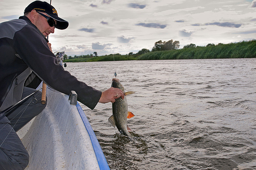 Ciche ustawienie pontonu na napływie obiecująco wyglądającej, odrzańskiej główki. Tonący woblerSDR 4cm ląduje kilka metrów powyżej przelewu, bliżej nurtu i łukiem wchodzi na ostatnie kamienie przemiału. W tym właśnie momencie następuje silne branie dużego jazia, ponad 50cm, który z pomocą silnego nurtu próbuje spłynąć z prądem w dół rzeki, dodatkowo szarpie się aby uwolnić tkwiącą w pysku kotwiczkę przynęty.