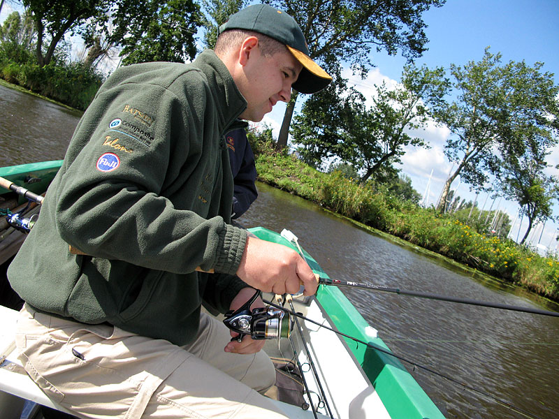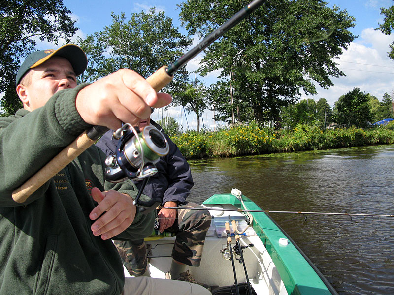 Łódź kotwiczymy przy twardym stoku tak, aby dokładnie obserwować zachowanie się wędzisk pod różnym obciążeniem. Rozpoczynamy test od najniższej gramatury, zakładając kolejno coraz większe obciążenia. Na początku testujemy 14-sto gramówki. Przy główkach siedmiogramowych nie mamy kontaktu z przynętą. Jesteśmy rozczarowani, zakładamy przynęty z główką 9 gramów. Wędki zaczynają reagować. Mamy ciągły kontakt z przynętą, dobrze widzimy sygnalizację opadu na szczytówce, czujemy dno.