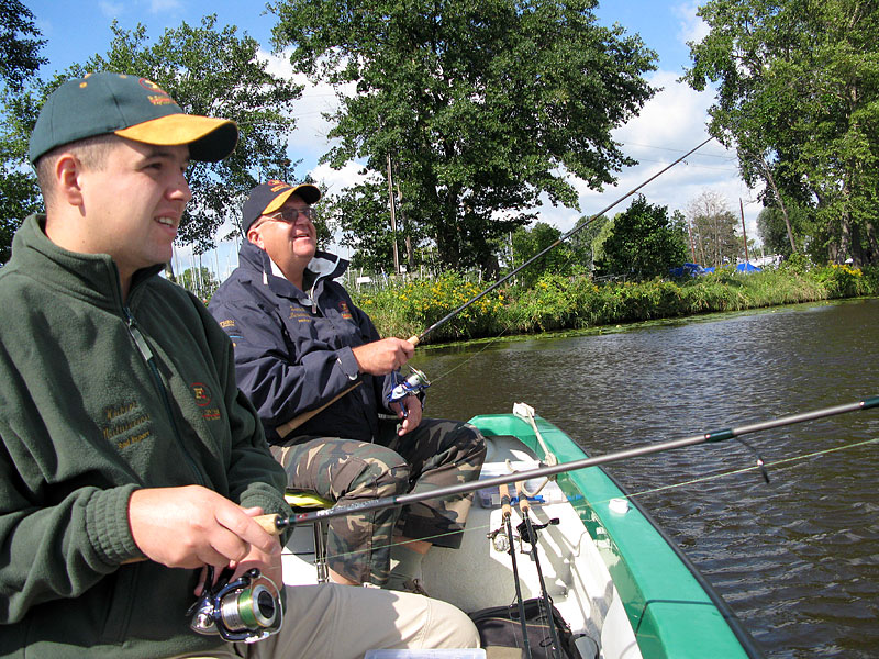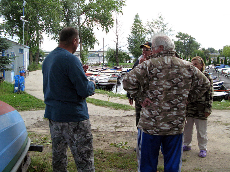 Kotwiczymy łódź, zabieramy wędki i schodzimy na brzeg. Spotykamy się z wędkarzami którzy są na naszej przystani.